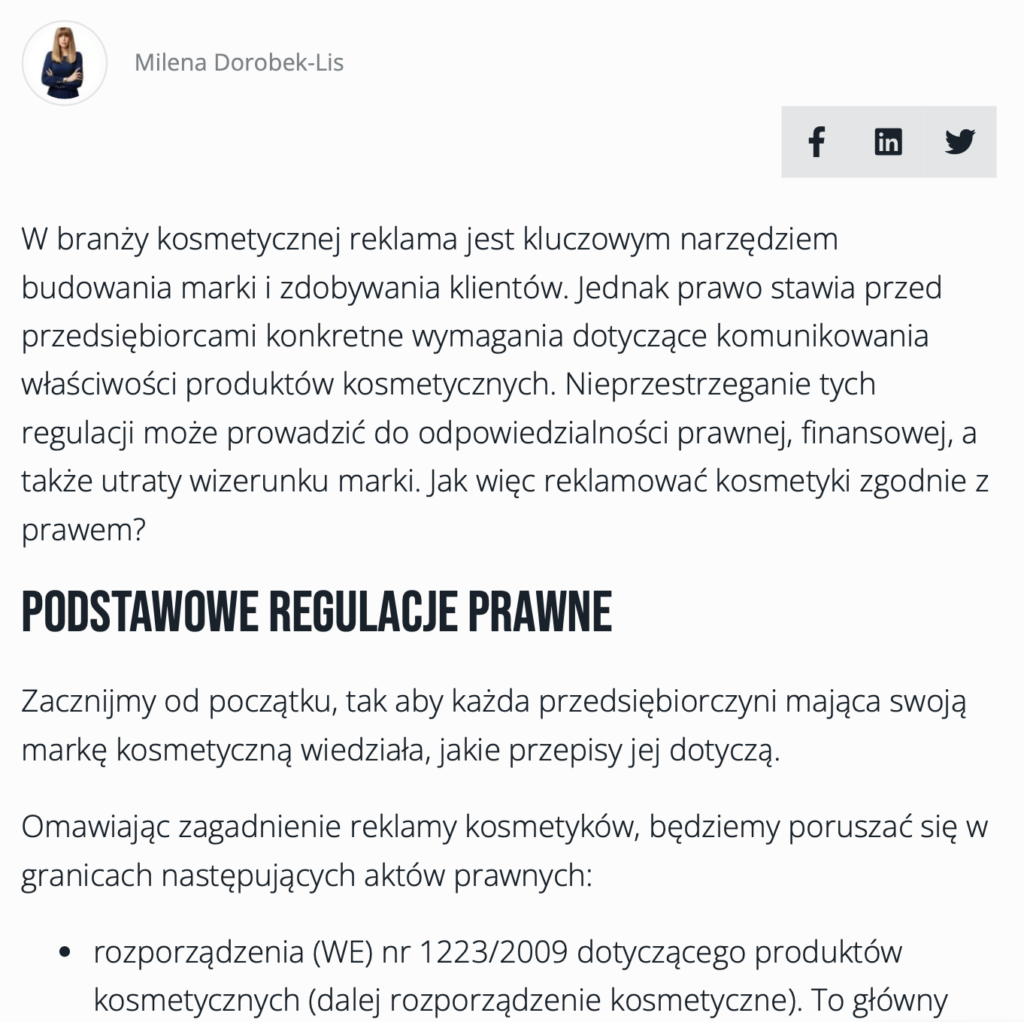 W czwartym artykule dla platformy Girlbosskie.pl omawiam krok po kroku, w jaki sposób legalnie reklamować produkty kosmetyczne, zarówno tradycyjnie, jak i w mediach społecznościowych. Bazując na wieloletnim doświadczeniu zwracam uwagę na istotne dla przedsiębiorcy kwestie, takie jak: